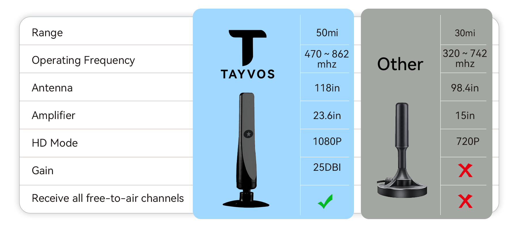 The Tayvos TV Antenna utilizes an advanced 25DBI High-Gain Design. This crucial technology is engineered to boost signal reception, especially for weak signals in long-distance or complex environments. High gain ensures your TV picture is stable and smooth, eliminating interference for a clearer, more reliable viewing experience.